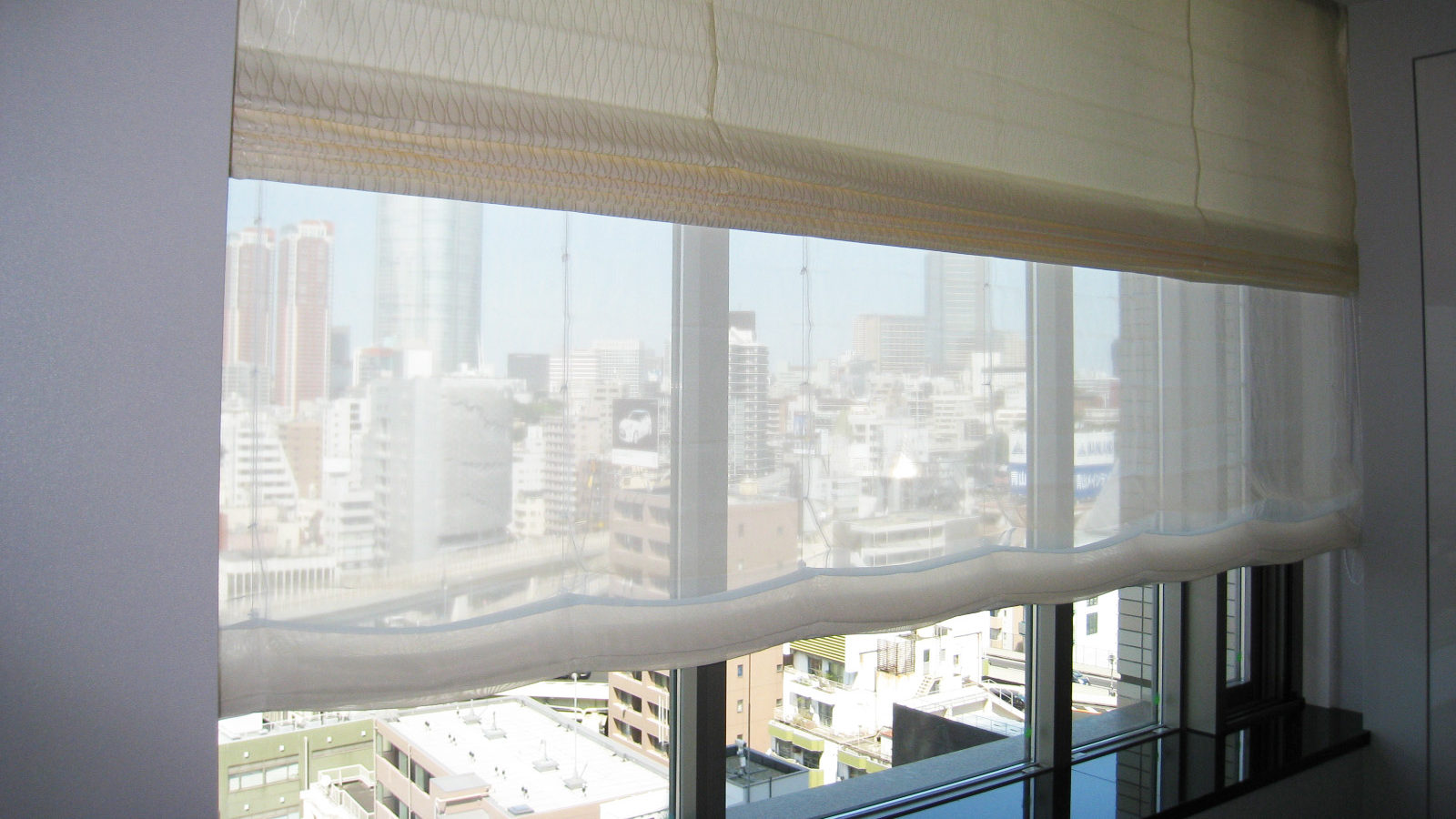 シェードですが、シェードはカーテン地で仕立て上げられており、コードの操作でたたみ上げていく構造のシェードをローマンシェードといい、多彩な生地の柄が楽しめます。